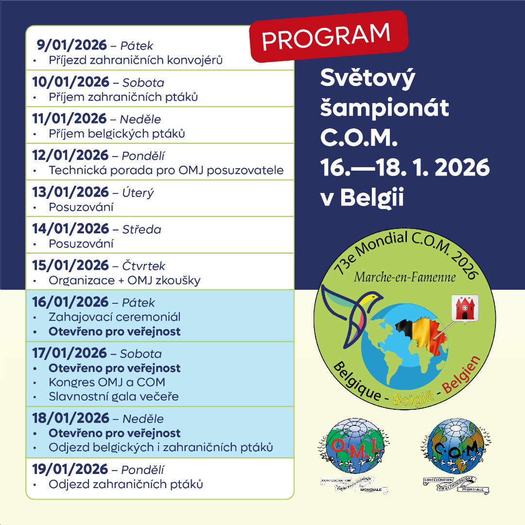 - 12:00–13:00 – Vyhlášení vítězů (pořadí: Agapornis/Forpus → Astrildi → Andulky → Karduelidi)