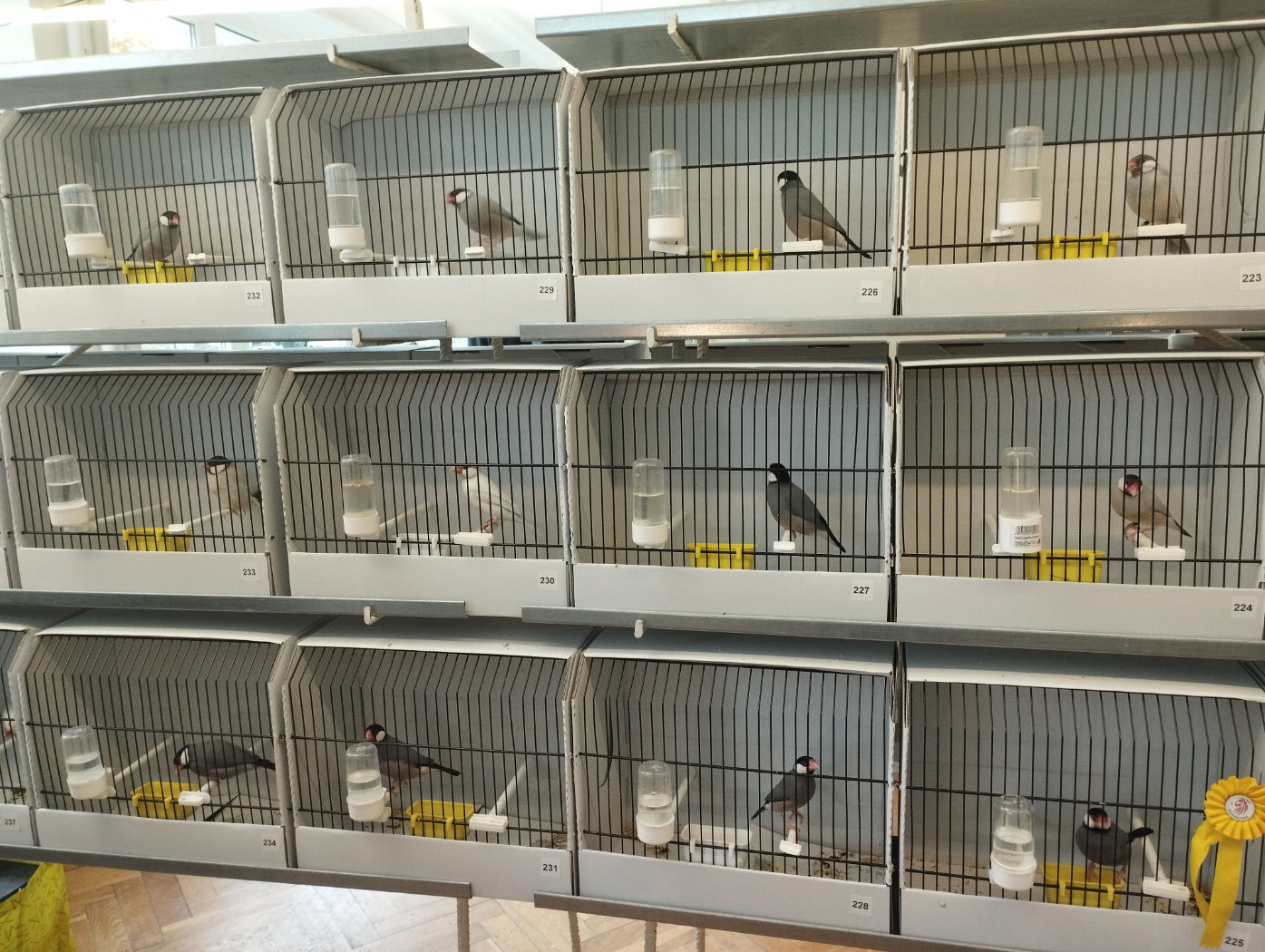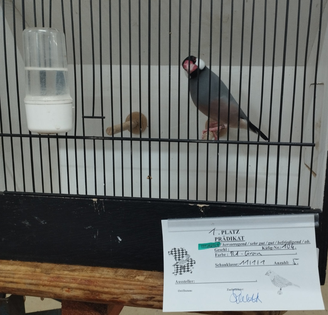 Po dvouleté přestávce opět vystavovali čeští chovatelé rýžovníků ( konkrétně Hrubeš a Vančura) na bavorské výstavě v Karlshuldu. Krom dominantních zebřiček se zde vystavují ještě chůvičky a také právě rýžovníci. Posuzovali nám dobře známí Bernd Wiedemann a Tanja Schubert-Lehmann. Němci si potrpí na určitou úroveň, takže jako své asistenty měli dva adepty na posuzovatele, kteří byli označeni obřími zelenými šerpami s nápisem Scholar. Více očí víc vidí, takže naši ptáci byli sesekáni na bodech, kdy srážky bodů byly za poškozené zobáky. Poprávu, cestou na výstavu jsme slyšeli, že rýžovníci sekají do mřížek bodovacích klecí. Těžko říci, co se jim nelíbilo. I tak výrokem výborný posuzovatelé ocenili celkem 5 rýžovníků, což vzhledem k výše uvedeným okolnostem je vynikající výsledek. Vyhrál šedý samec chovatele Vančury a vystřídal tak na pozici vítěze svého českého kolegu, který dominoval v Bavorsku posledních asi 7 let.